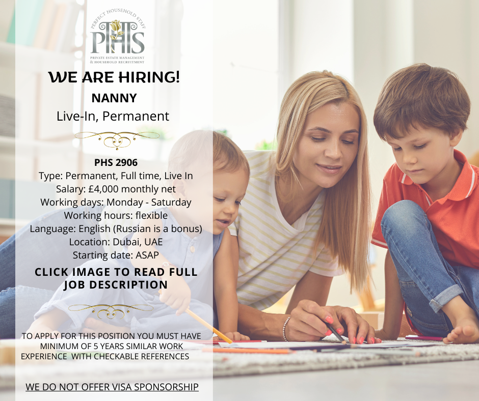Perfect Household Staff is delighted to present a fantastic opportunity for an experienced and professional Live-in Nanny to join a prestigious family in Dubai, UAE. This role involves providing exceptional care for two young boys, aged 8 months and 2 years, within a fully staffed and high-profile household. We are seeking a dedicated individual with a strong educational background, excellent English skills, and proven experience in formal childcare settings, to ensure the children’s development and well-being are top priority.